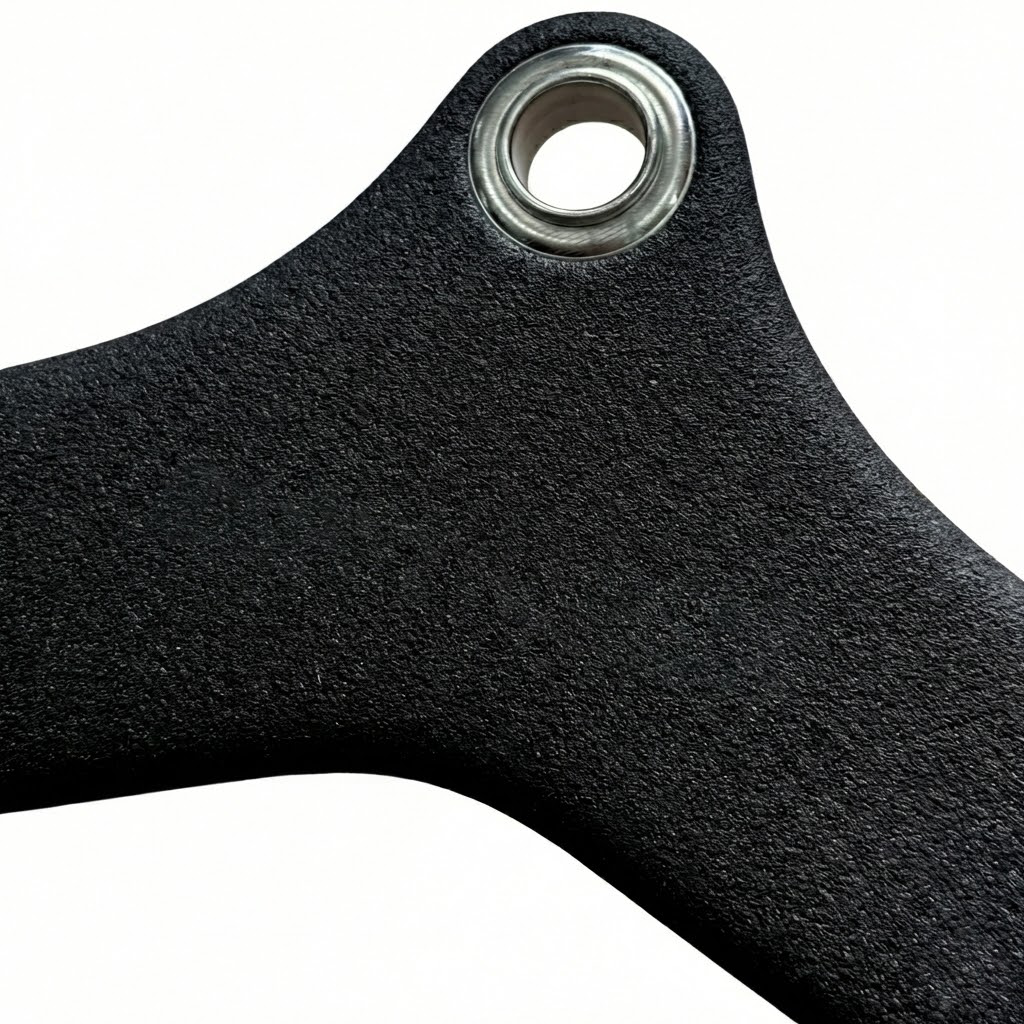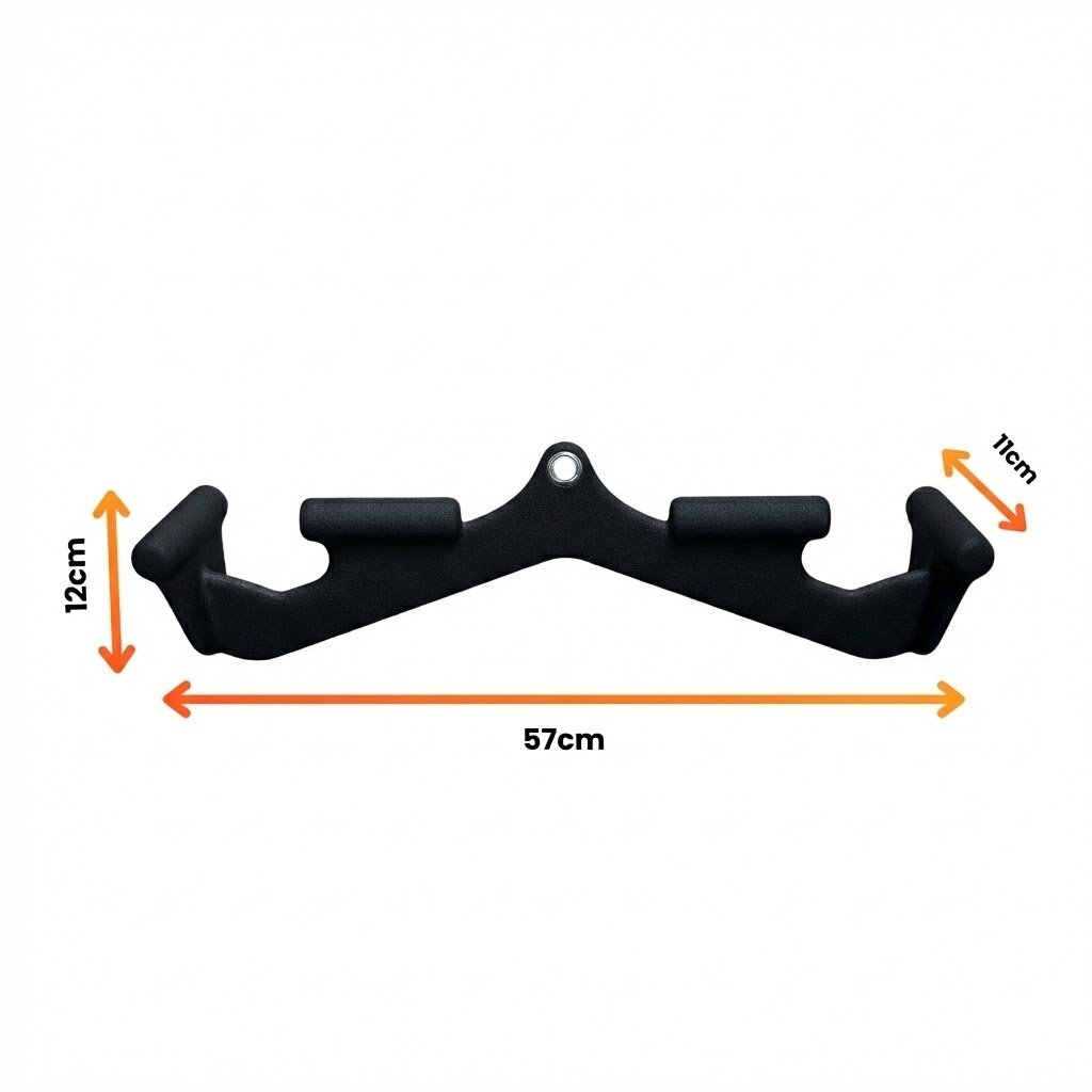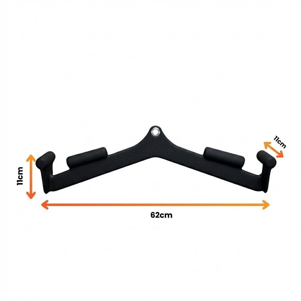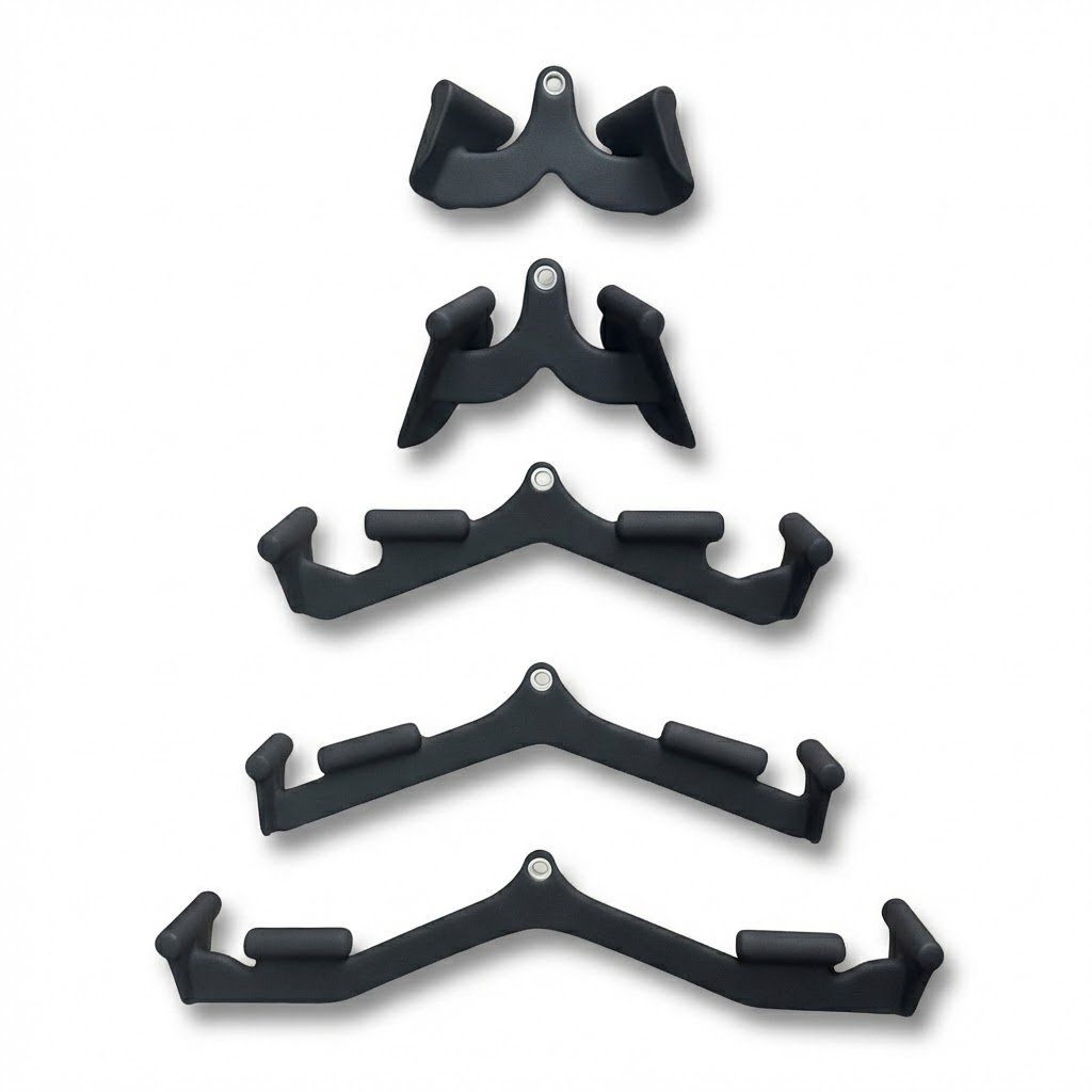 Kit Profissional com 5 Puxadores Ergonômicos. Atualize a biomecânica do seu parque de equipamentos. Este kit completo oferece 5 variações de pegada (da neutra fechada à supinada aberta), construídas com acabamento preto fosco texturizado que garante aderência máxima sem escorregar. Projetado com geometria anatômica para isolamento muscular superior e anéis de engate em aço reforçado para alta durabilidade.